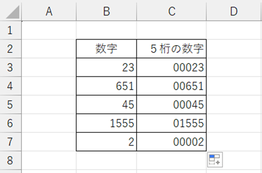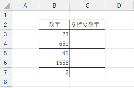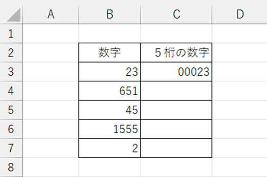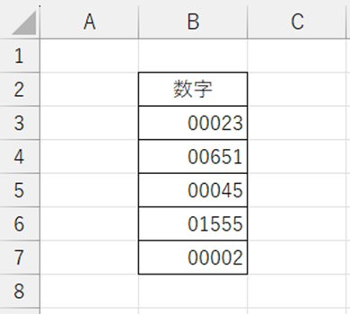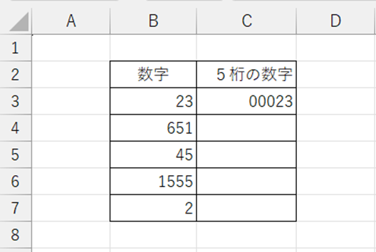 これでB3セルからB7セルの数字を5桁の数字へ揃えることができました。
