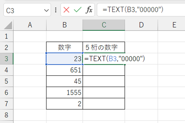 =TEXT(B3, “00000”) の「00000」は、5つの数字が入る“枠”のようなものです。