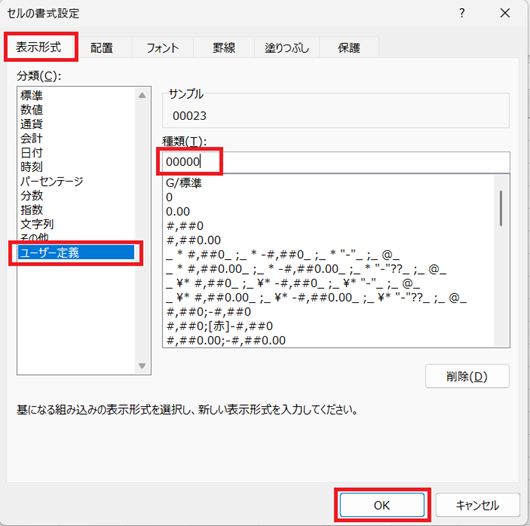 そこに「23」を入れると、前の3つの枠が空いてしまうので、Excelが自動で「0」を入れて「00023」としてくれます。