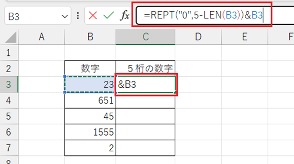 そのとき、5−LEN(B3) により、B3 の桁数を指定桁数(今回は 5 桁)から引いて求めます。