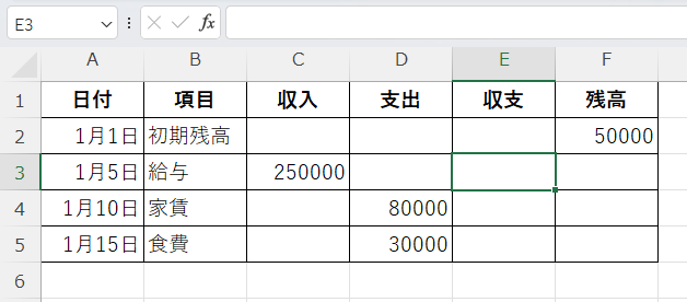 例えば、以下のような収支管理表を作成する場合を考えてみましょう。