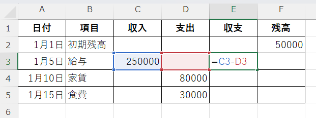 この数式は「収入(C3)から支出(D3)を引く」という意味です。
