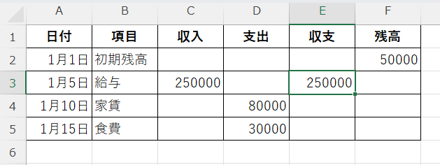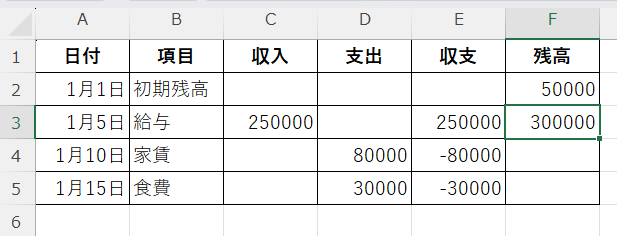 E列に収支、F列に累計残高を表示したい場合、この方法を使います。