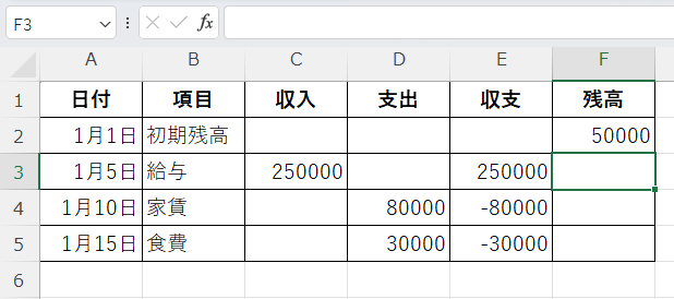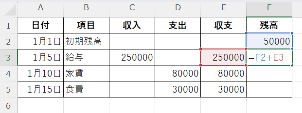 この数式は「前回の残高(F2)に今回の収支(E3)を足す」という意味です。