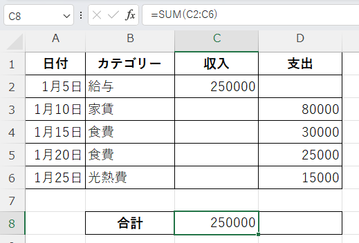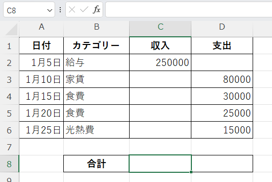 同様に、支出合計のセル(D8)に以下の数式を入力します。