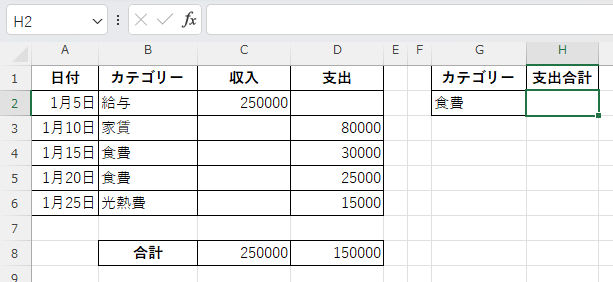 家賃 | =SUMIF($B$2:$B$6,G2,$D$2:$D$6) |