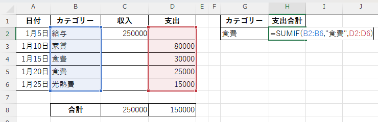 この数式は「B2からB6の範囲で『食費』という文字列を探し、該当する行のD2からD6の値を合計する」という意味です。