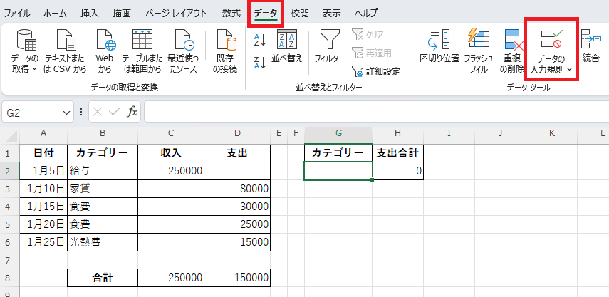 支出の合計「150000」(80000+30000+25000+15000)が表示されます。