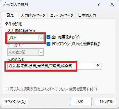 入力規則でカテゴリーを選択式にする方法