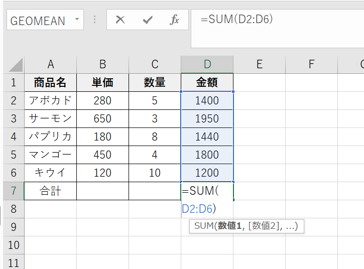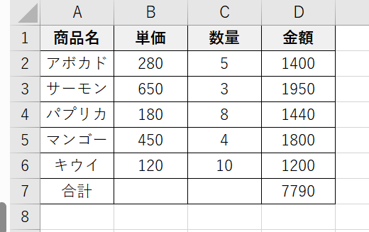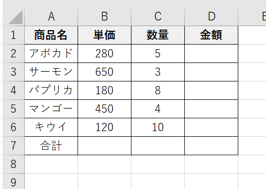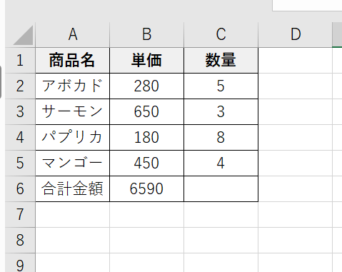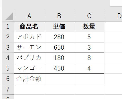 このデータで各商品の単価×数量を計算し、すべての金額を合計したい場合、この方法を使えば簡単に実現できるでしょう。