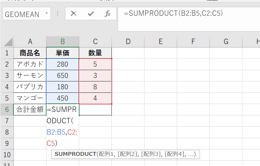 エクセルで掛け算をまとめて計算する方法1【SUMPRODUCT関数で掛け算と合計を同時に】