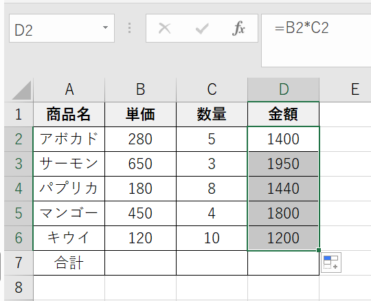 また、配列数式を使った方法も可能です。D2からD6を選択し、数式バーに「=B2:B6*C2:C6」と入力して「Ctrl + Shift + Enter」を押せば、すべてのセルに一度に数式が入力されるでしょうか。