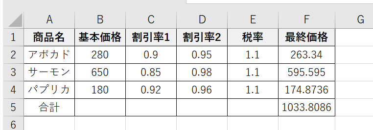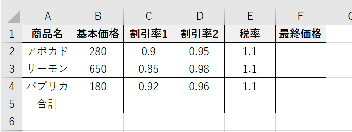 基本価格に複数の係数を行方向に掛け算して、最終価格を計算したい場合を考えてみましょう。