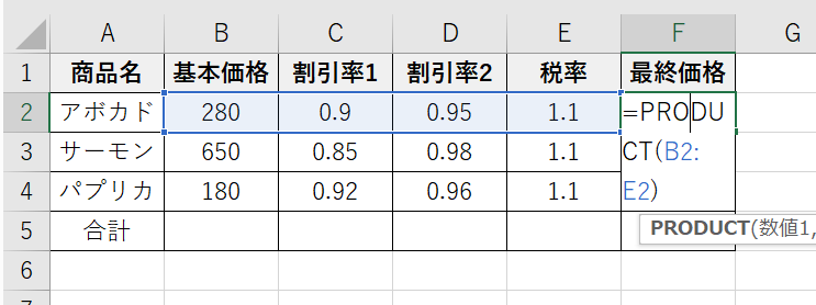 通常の掛け算記号を使うと「=B2*C2*D2*E2」と長くなりますが、PRODUCT関数なら簡潔に記述できます。