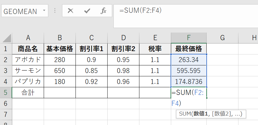 行方向の計算結果を合計したい場合は、F5セルに以下の数式を入力します。