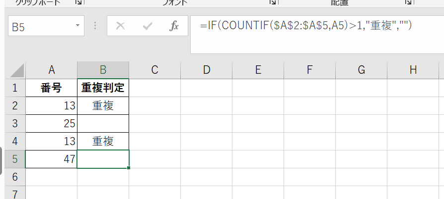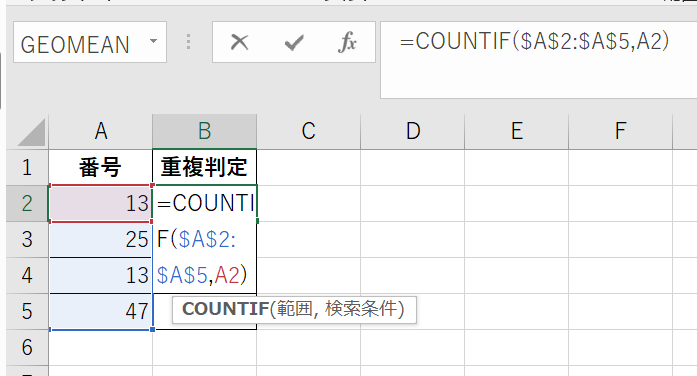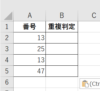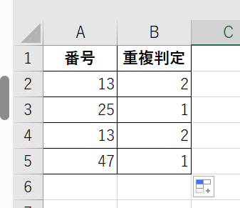A列の番号に重複があるかどうかをB列で判定したい場合、この方法を使います。