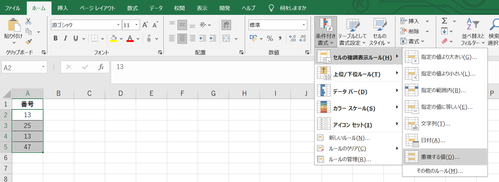 「セルの強調表示ルール」→「重複する値」を選択しましょう。