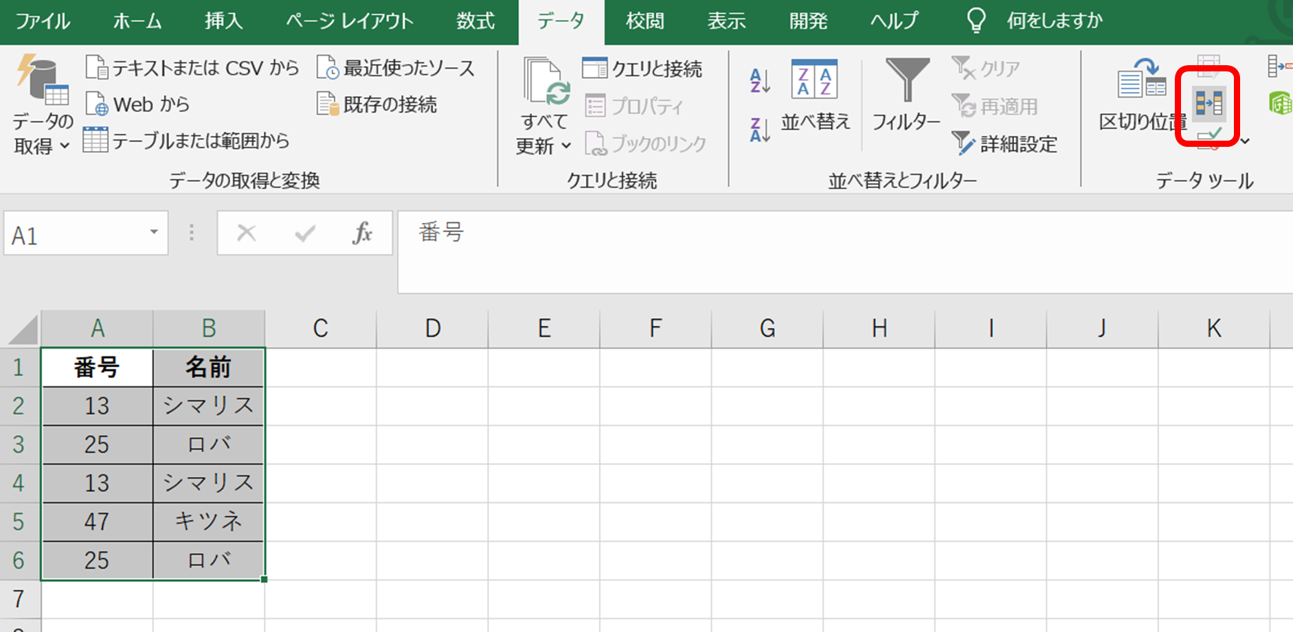 「データ」タブをクリックして、「重複の削除」ボタンをクリックしましょう。