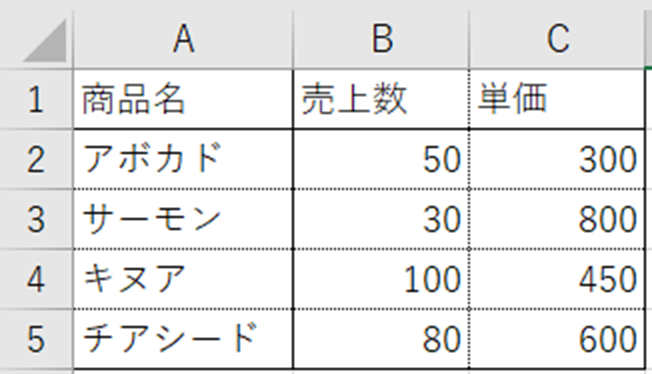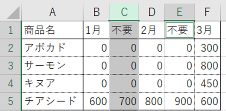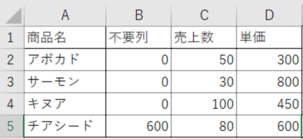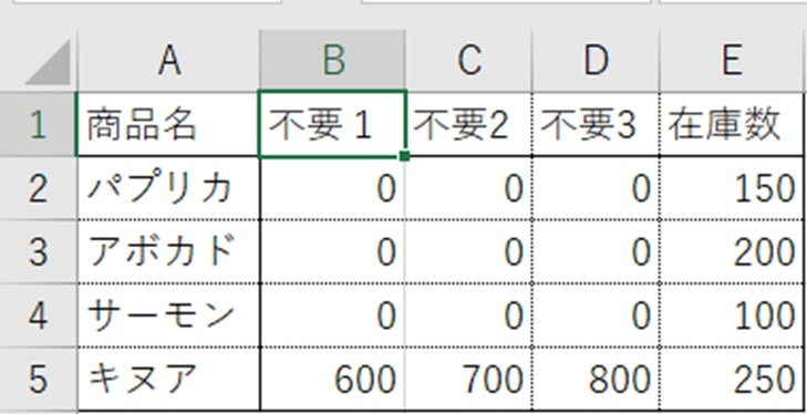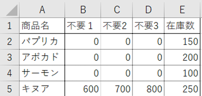 例えば、以下のような在庫管理データで複数の不要な列がある場合を考えてみましょう。