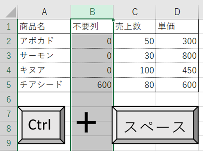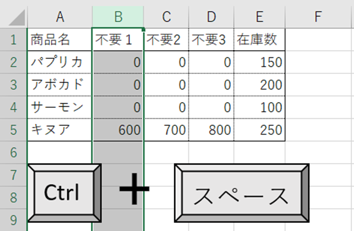 「Ctrl + スペース」キーを押して、B列全体を選択します。