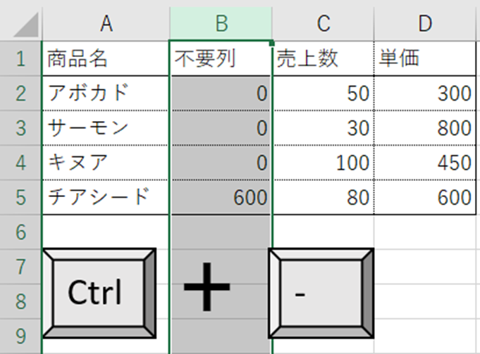 列が選択された状態で、「Ctrl」キーを押しながら「-(ハイフン・マイナス)」キーを押してください。