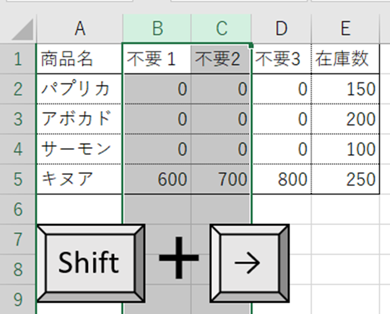 B列が選択された状態で、「Shift」キーを押しながら「→(右矢印)」キーを押してください。押すたびに選択範囲が右に1列ずつ拡大していくわけです。