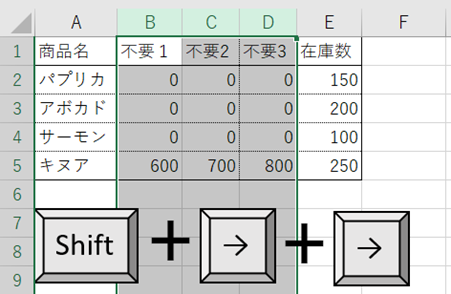 削除したい列の数だけ矢印キーを押します。この例では、B列、C列、D列の3列を選択したいので、右矢印キーを2回押すことで、B列からD列までの3列が選択されます。