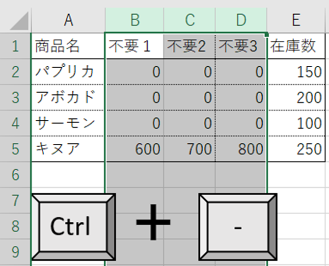 複数の列が選択されていることを確認したら、「Ctrl + -」キーを押して削除を実行します。