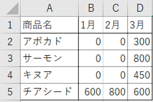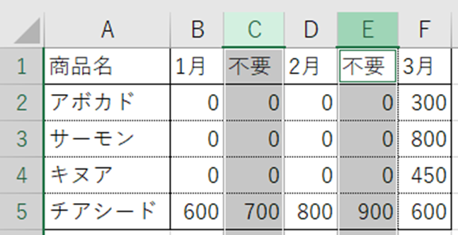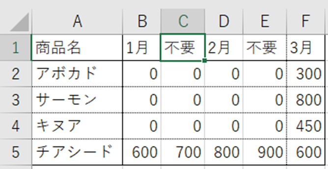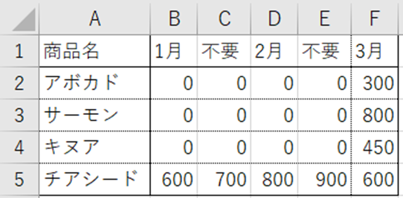 例えば、以下のような月次レポートで特定の列だけを削除したい場合を考えてみましょう。
