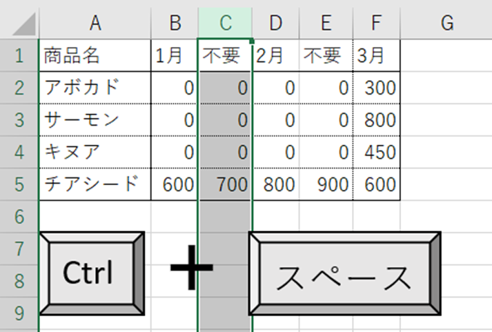 【操作のポイント:Ctrl+スペースで列選択してからCtrl+-で削除がキーボードだけで完結する基本操作】
