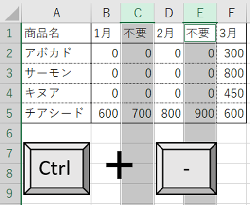 そんな時には、Ctrlキーを使って離れた複数の列を個別に選択してから、Ctrl+-で一括削除する方法が効率的です。