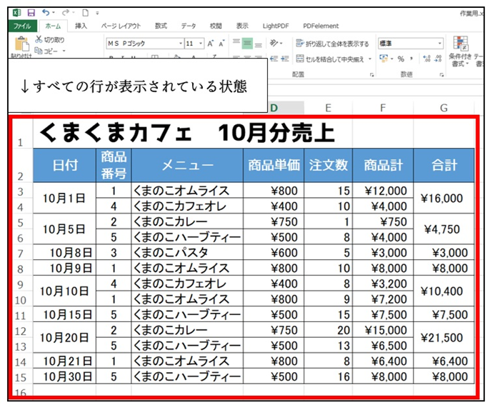 これで、フィルターによって隠れていた行がすべて表示されます。