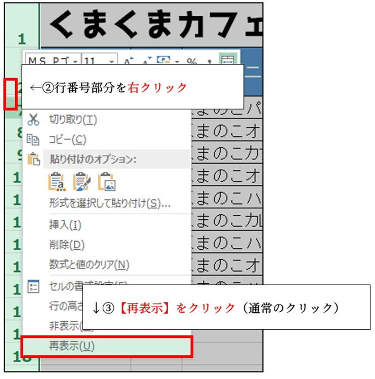 – シート全体を選択して一括再表示:Ctrl+Aで全選択してから右クリックで「再表示」を選択し、隠れている行や列を一気に表示