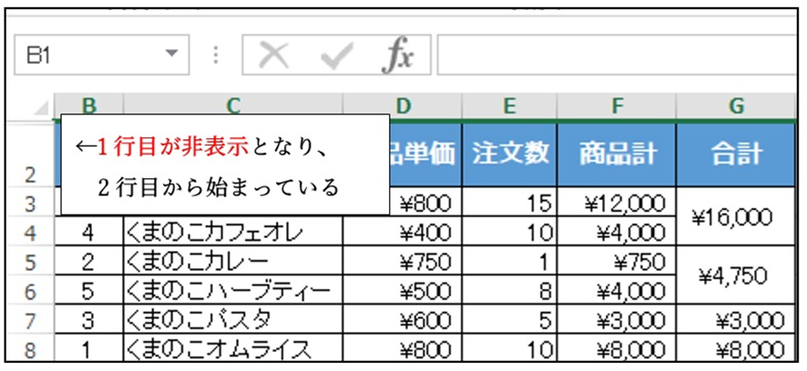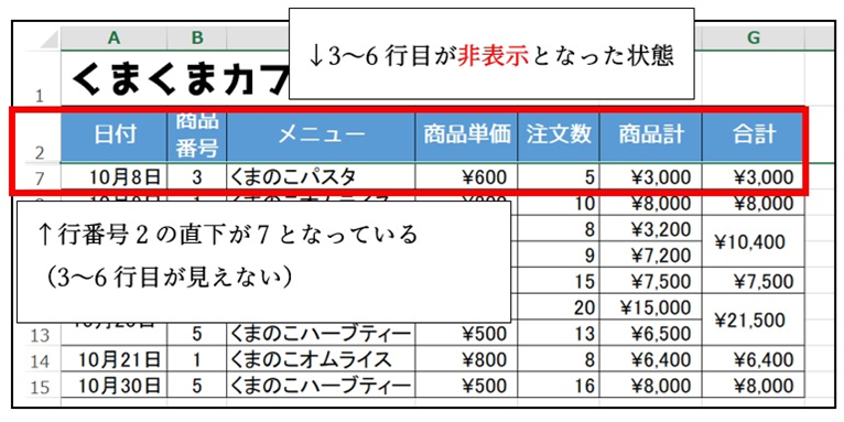 このような状態になったことはありませんか?左側の行番号を確認すると、番号が飛んでいることから3~6行目が非表示となっていることがわかります。