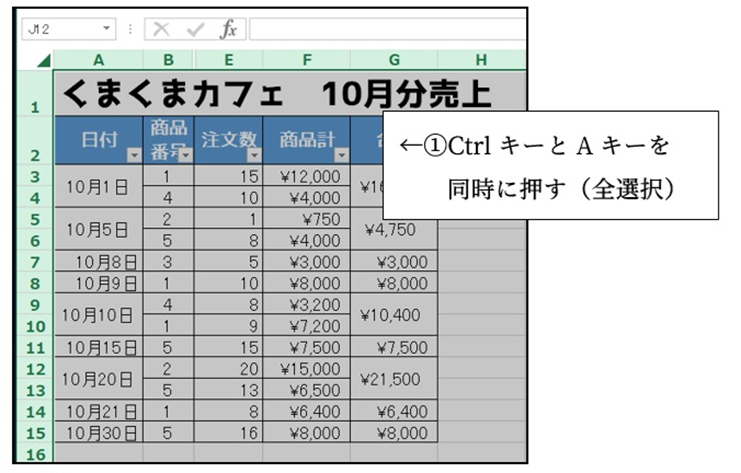データ範囲のどこかにフィルターボタンが表示されているか確認します。