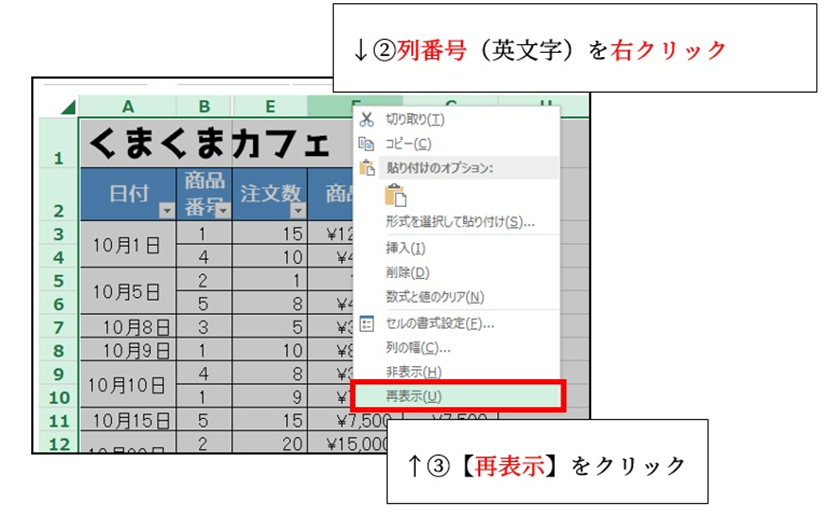 続いて英文字の列番号(どこでも可)を右クリックし、【再表示】を選択します。