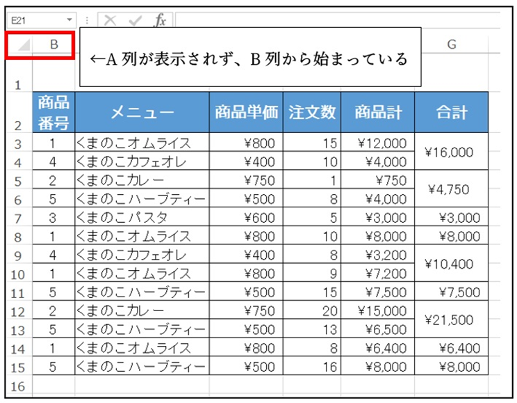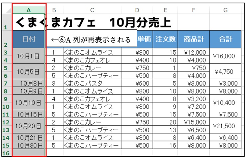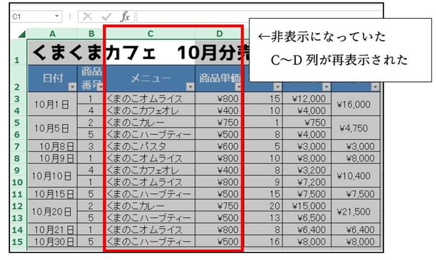 列についても同様に、列番号(A、B、Cなど)の上で右クリックして「再表示」を選択すれば、非表示のすべての列が表示されるでしょう。