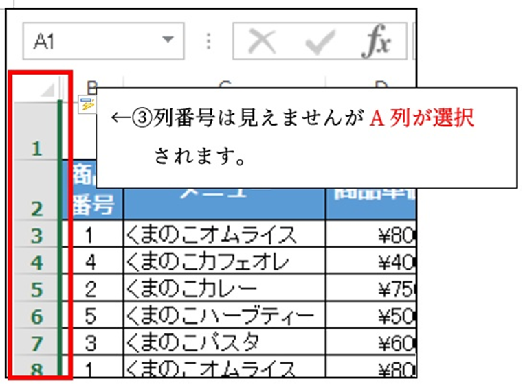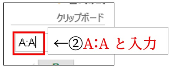 A列が非表示で再表示できない場合、画面左上の「名前ボックス」(通常はセルアドレスが表示されている場所)をクリックします。