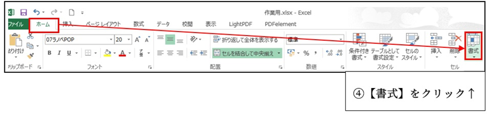 続いて、ホームタブ⇒セルグループにある【書式】をクリックします。