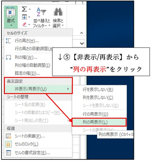 つづいて【非表示/再表示】をクリックし、【列の再表示】を選択します。