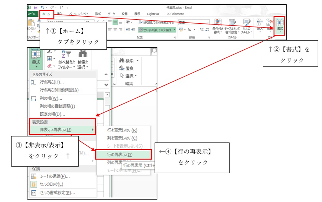 Enterを押したあと、列の表示と同様に【ホーム】⇒【書式】⇒表示形式の【非表示/再表示】の順にクリックしていき、“行の再表示”を選択します。