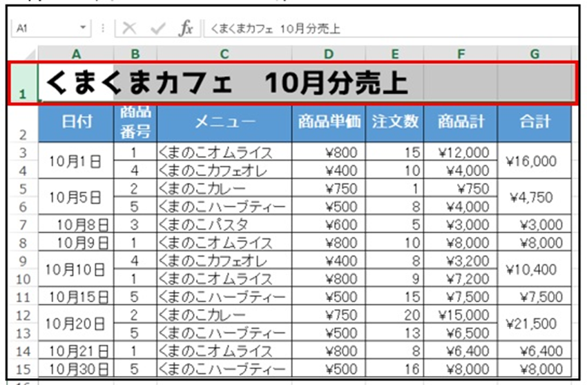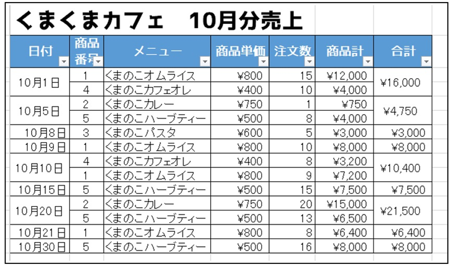 ※下の画像では【商品番号が1】(くまのこオムライス)の行のみが表示された状態です※