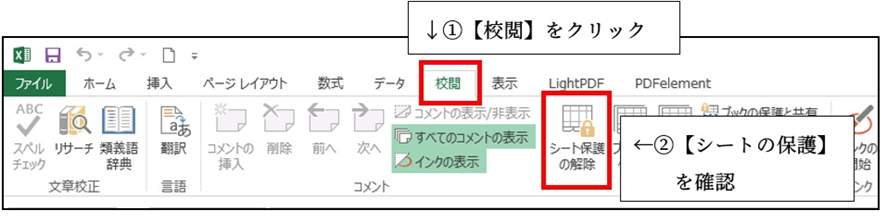 「校閲」タブまたは「ホーム」タブを開き、「シート保護の解除」というボタンが表示されているかチェックします。