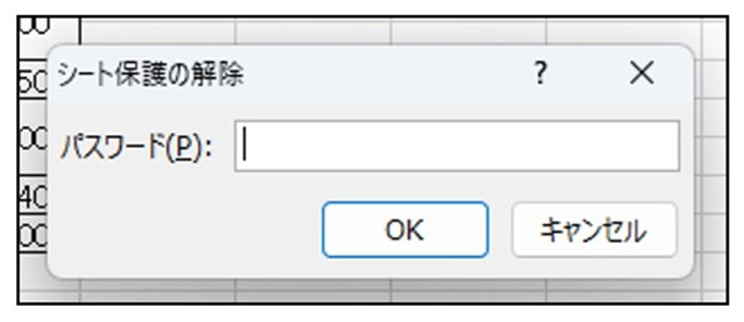正しいパスワードを入力して「OK」をクリックすれば、シート保護が解除され、行や列の再表示が可能になります。