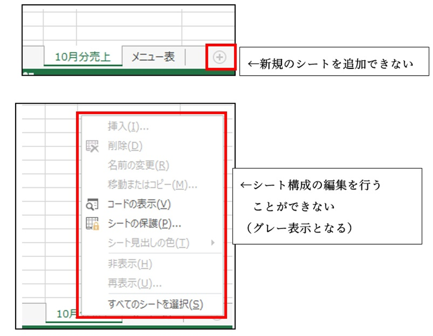 ブックの保護がかかっていると、シート構成の変更や行列の表示変更ができないことがあります。