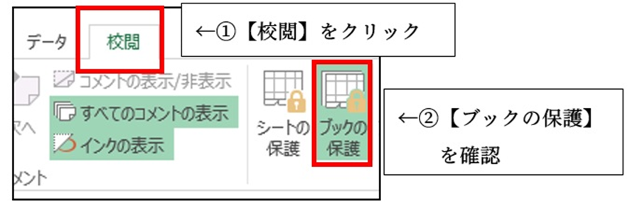このような場合は「校閲」タブを開き、「ブック保護の解除」ボタンがあるか確認しましょう。