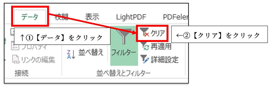 フィルターが原因の場合は、「データ」タブから「クリア」または「フィルター」ボタンをクリックしてフィルターを解除します。