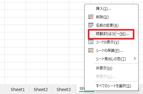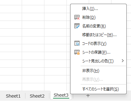 全てのシートを選択したい場合は、最初のシートタブを右クリックして「すべてのシートを選択」を選択することもできますが、この場合は全シート選択になるため、最低1枚は残す必要があることに注意してください。