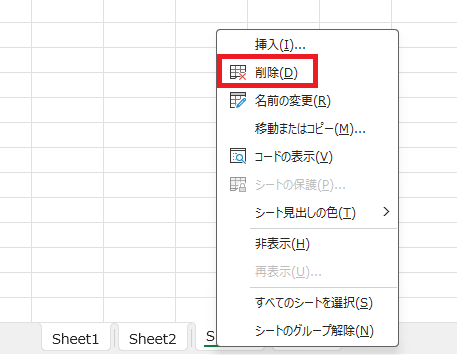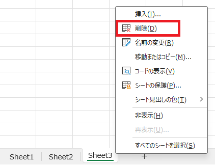 ・右クリックまたはAlt→H→D→Sでシートを削除