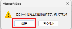 確認メッセージが表示されます。「選択したシートは完全に削除されます。続行しますか?」という内容のメッセージが出るので、問題なければ「削除」ボタンをクリックしてください。